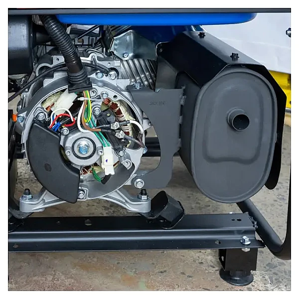 Синхронный альтернатор с обмоткой из меди не перегревается, передает качественный "чистый" ток и отличается продолжительным ресурсом работы. На бензогенератор установлен датчик контроля уровня масла. Если его количество снижается до минимума, то агрегат отключается, а при включении не запустится.