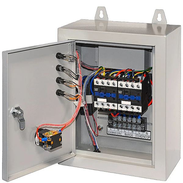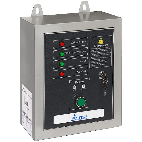 Коммутационное оборудование заключено в металлический кожух, который защищает электронику от пыли и воды. Кожух, при необходимости, можно закрыть на замок - актуальная функция с учетом того, что внутри блока АВР-С TSS 9000D/230 расположены провода под напряжением. Кроме того, такая особенность поможет предотвратить нежелательный доступ.