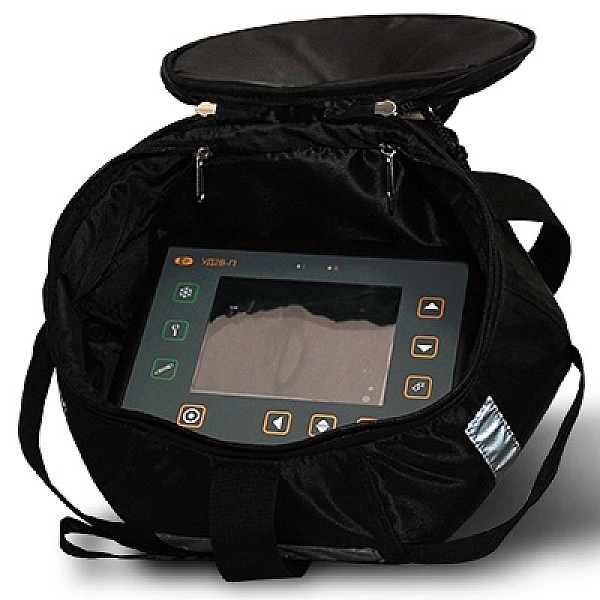 - сумка укомплектована выносной ручкой (петля на руку) и стальным тросом со съемными карабинами. Трос служит для переброса сумки лежневка-траншея или через трубу между двумя дефектоскопистами, подъема оборудования наверх при высотных работах.