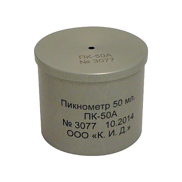 Алюминиевый пикнометр емкостью 50 мл. представляет собой стакан с притертой крышкой, на которой имеется отверстие для выпуска излишков испытуемого материала. Пикнометр изготавливается из твердого алюминиевого сплава с низким коэффициентом температурного расширения.