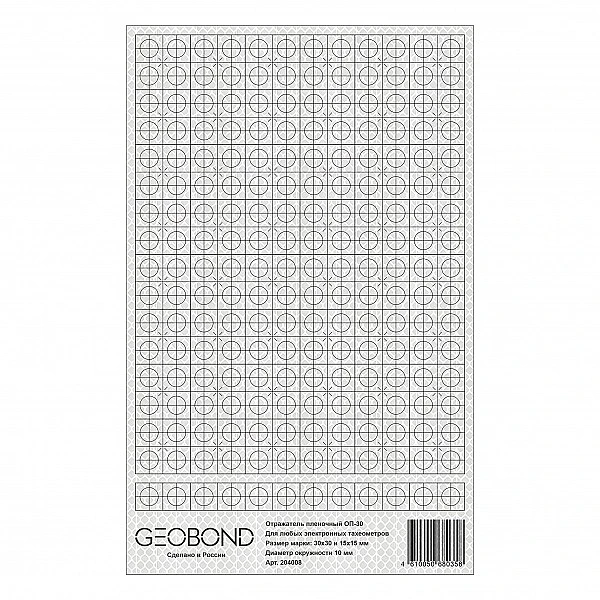 Отражатели Geobond ОП-30 имеют оригинальную форму, которая позволяет автономно использовать марку либо целиком (30 х 30 мм), либо 1/4 ее часть (15 х 15 мм). Это создает дополнительные удобства, т. к., приобретая всего один тип пленочного отражателя, пользователь имеет возможность, оптимально подбирать необходимый размер марки в зависимости от расстояний, на которых планируются измерения. К достоинствам разметки относятся бисекторные и контрбисекторные штрихи различной толщины, значительно упрощающие наведение на них, а также повышающие точность взятия углового отсчета при работе на больших расстояниях. Разметка пленочного отражателя нанесена специальной водостойкой краской, выдерживающей воздействия спирта и бензина, а сама пленка имеет гарантированный срок службы при уличной эксплуатации 10 лет.