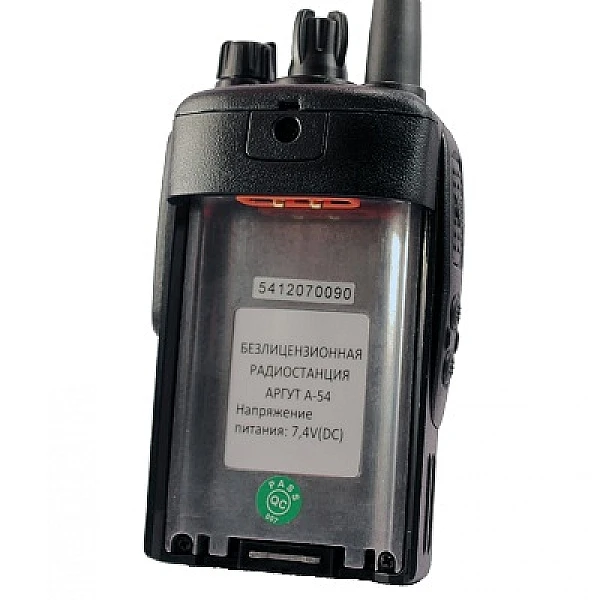 Радиостанция Аргут А-54 предназначена для работы в диапазоне 400-480 МГц. Максимальная мощность 5 Вт, предусмотрена возможность изменения выходной мощности для экономии заряда аккумулятора. Комплектуется Li-ion аккумулятором, емкостью 2300 мАч.